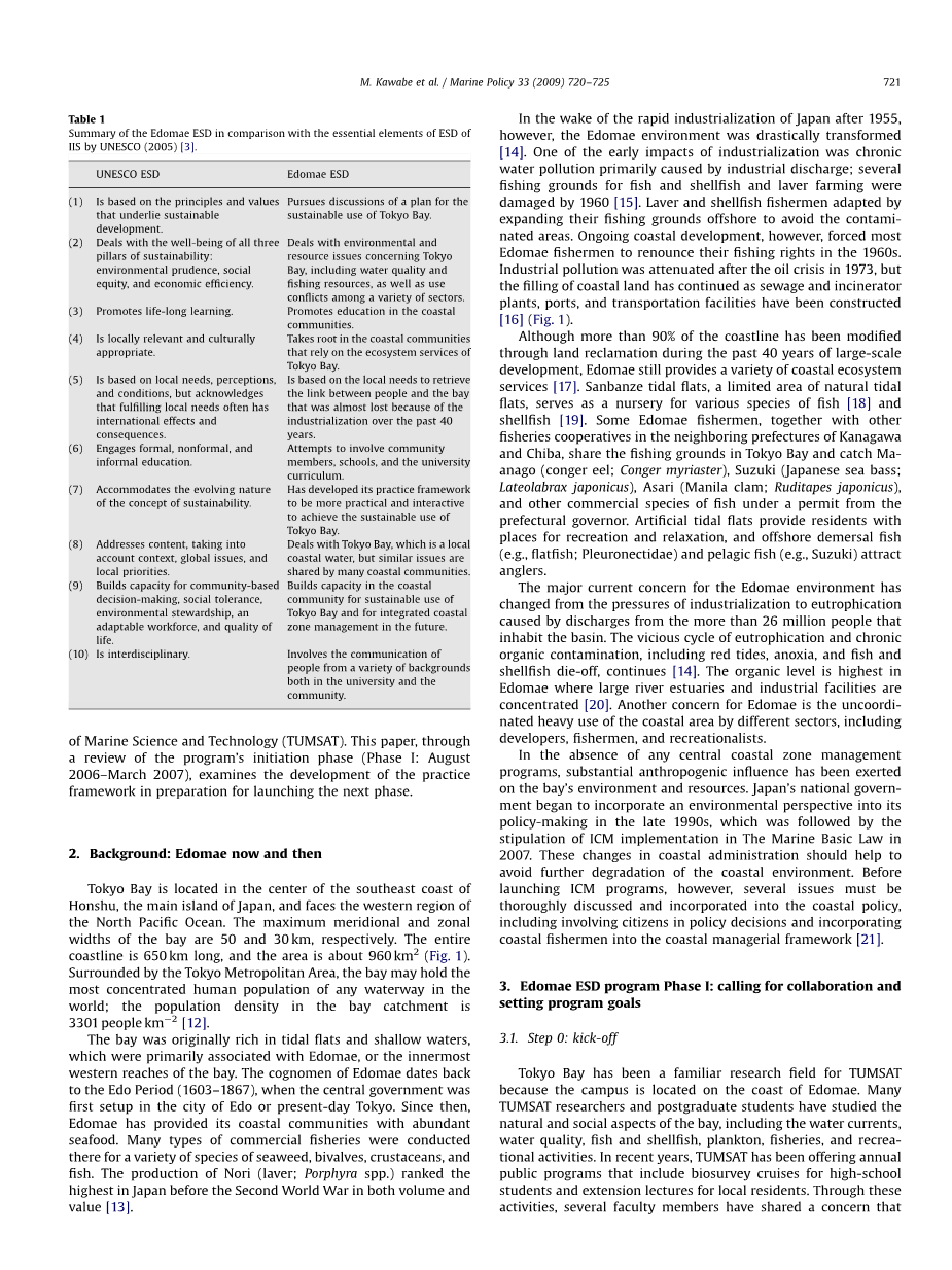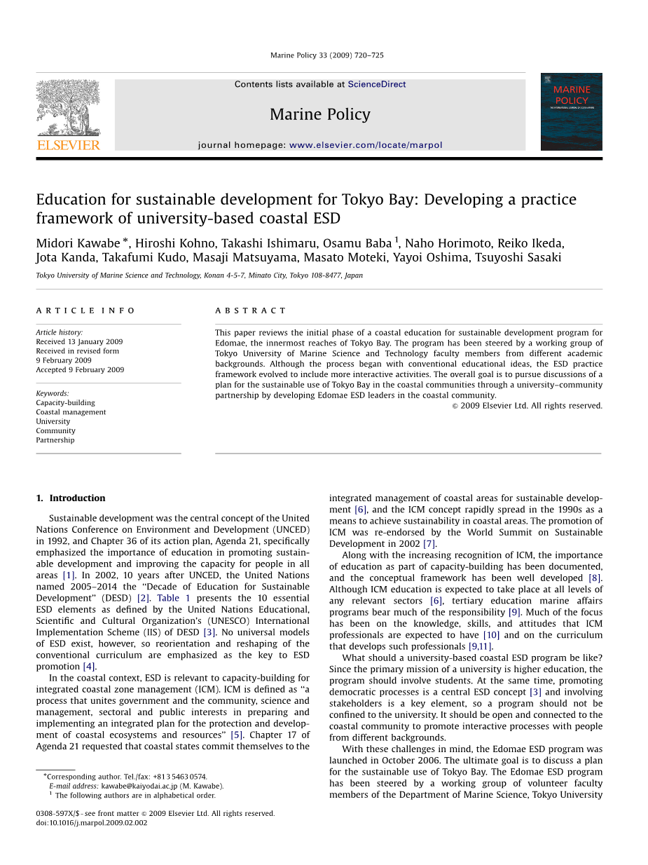 摘要:本文回顾了沿海可持续发展教育项目的初始阶段。江户,东京湾最深处。该项目由一个由东京海洋科技大学不同学科的教员背景。虽然这一过程始于传统的教育理念,但ESD实践框架的发展包括更多的互动活动。总体目标是进行通过大学社区在沿海社区可持续利用东京湾的计划通过发展沿海社区的Edomae ESD领导人建立伙伴关系。
